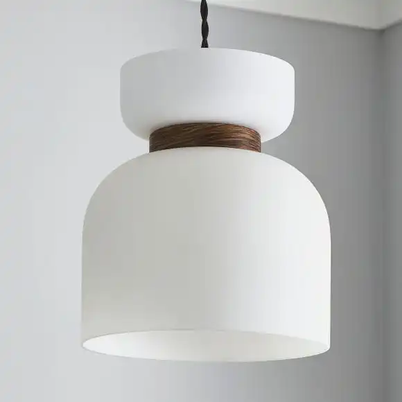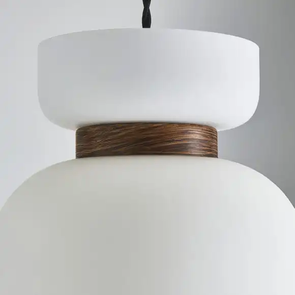 - The Tien easy fit pendant comes in beautiful matt opal glass and walnut wood effect