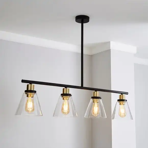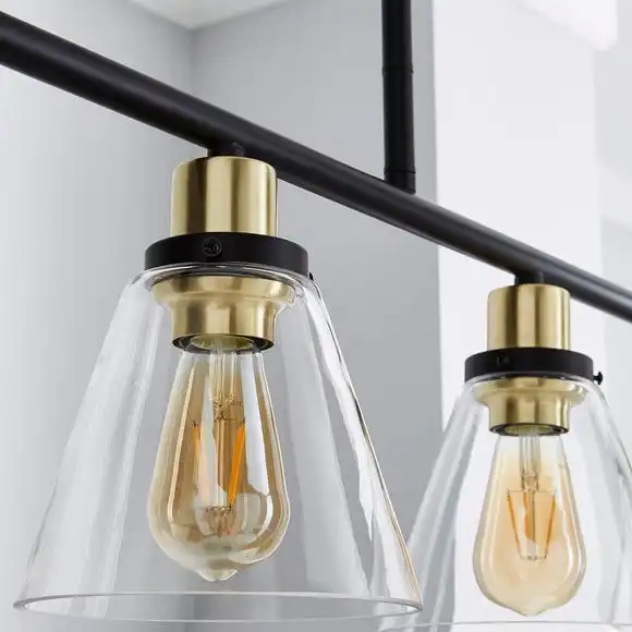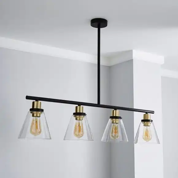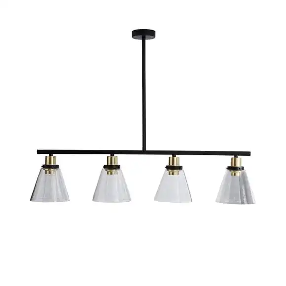 Perfect for any modern bar or dining area, the Warren 4 Light Glass Bar fitting features a contemporary matte black metal frame, with gorgeous conical glass shades and brass metal features. This light is also height adjustable from 30cm to 74cm