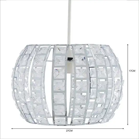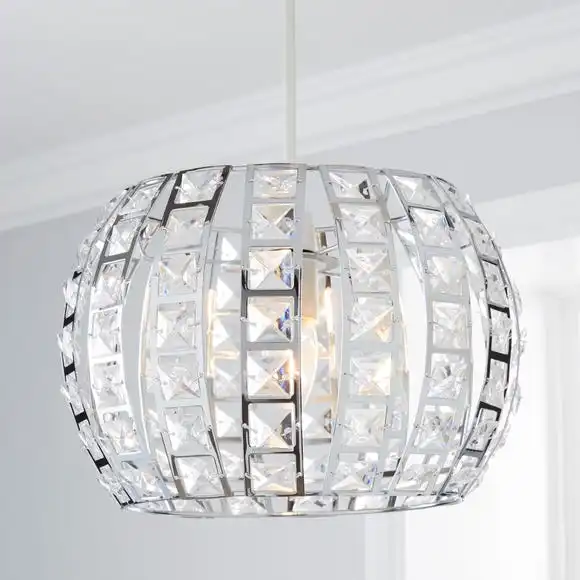 Fashioned with slightly curved vertical strips of acrylic clear jewels, this unique ceiling pendant will bring an art deco, sophisticated feel to your interior.
