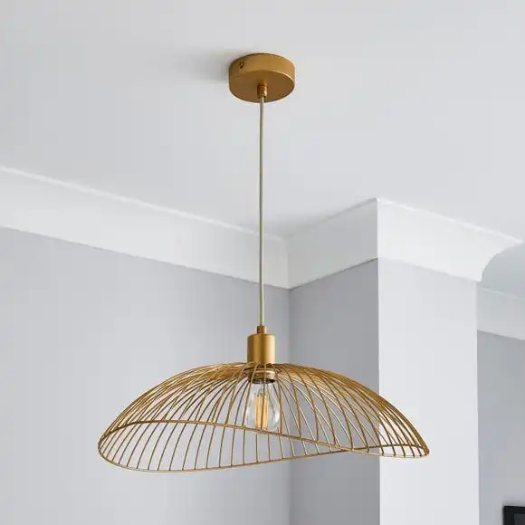 Part of the Elements trend, this beautiful Jaula 1 Light Gold Ceiling Fitting has a contemporary design that will complement an array of home decors. Featuring a satin gold effect finish base, with a height adjustable 50cm gold metal shade, perfect for adding a modern contemporary touch to any room. This piece is dimmable compatible and matching family items are available, helping to coordinate your home to create the dream look.