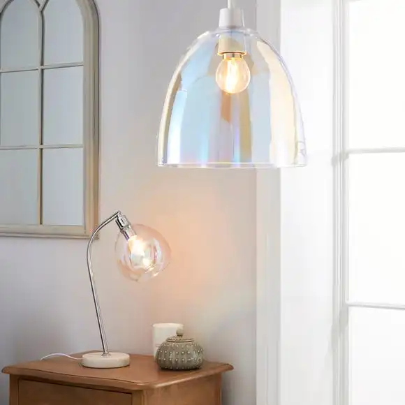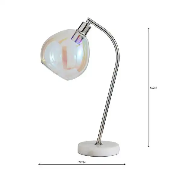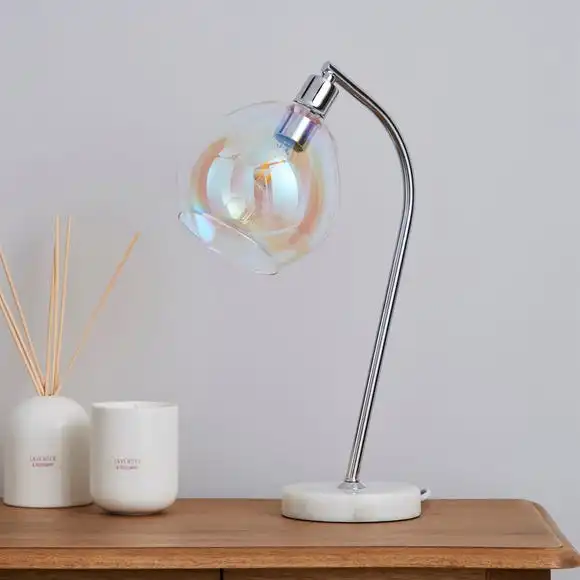 Made from durable glass in a dome shape, this table lamp has a solid marble base and an iridescent finish. With an inline switch and a cable length of 120cm.
