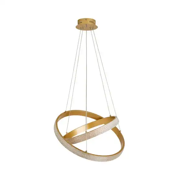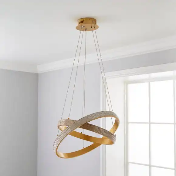 Add a glamorous touch to your home with the Hotel Harrogate 2 Light Ceiling Light. Featuring a suspended dual gold hoop with dual lit crystal effect LED integrated within the light, finished with a striking gold base and a height adjustable silver cable. The Hotel Harrogate Ceiling Light is the perfect piece to add a luxurious feel to your interior, pair with available matching family items to complete the look.