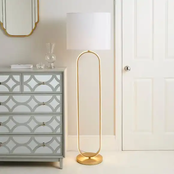 Add a luxurious touch to your home with the Hotel Harrogate Integrated LED Floor Lamp. Featuring a beautiful gold rectangular hoop design, with a crystal effect LED integrated within the light, finished with a striking gold base and a stylish white shade. The Hotel Harrogate Integrated LED Floor Lamp is the perfect piece for adding elegance to your décor, pair with available matching family items to complete the look.