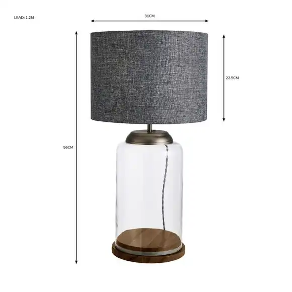 Add a timeless addition to your home with this stunning Natural History Museum Table Lamp, beautifully crafted with a clear glass base with a removable medium wood stand held in place with a rubber seal, perfect for displaying small ornaments or artificial plants inside for a unique look. This table lamp is complete with a beautiful grey fabric shade and an industrial grey metal stem. Coordinate your home with matching family items from the Natural History Museum range. This table lamp is inspired by the fabulous Museum building itself, and the display cabinets within.