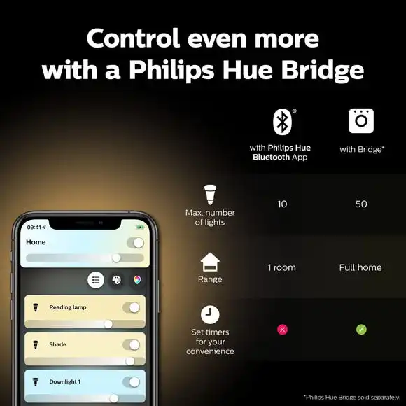 Experience the advanced technology of Philips’ smart lighting system with Bluetooth and Zigbee compatibility. Enjoy the ability to choose from over 16 million colours to perfectly match your mood and style. With the convenience of being able to control your lights from anywhere, you have complete control over your home lighting, even when you’re not there.