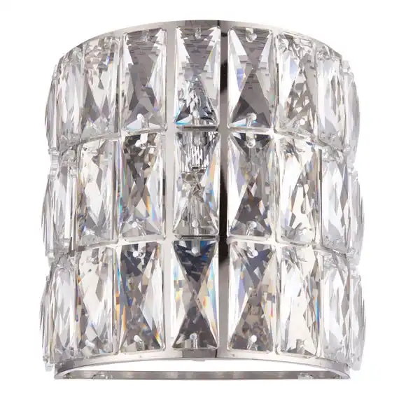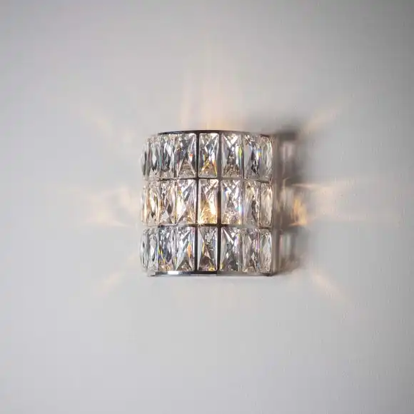 High quality clear crystals adorn this deluxe chrome plated Vogue Armoury wall light. The combination of clear crystals and polished chrome create a luxurious interior decorative wall light, perfect for placing in bedrooms or living room areas.