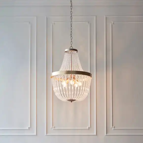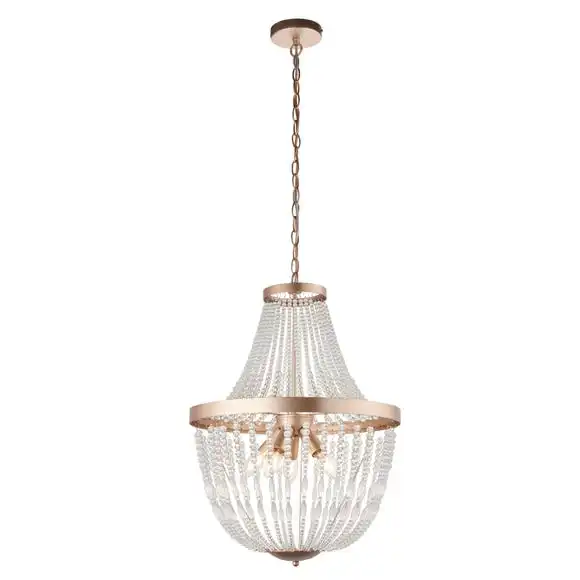 In a modern-style chandelier style, this gold celling light fitting is perfect for adding that elegant wow factor to any room. With a rose gold finish and clear glass beads this fitting is classic and contemporary. This light has an adjustable drop and is dimmable. This light is compatible with LED lamps.