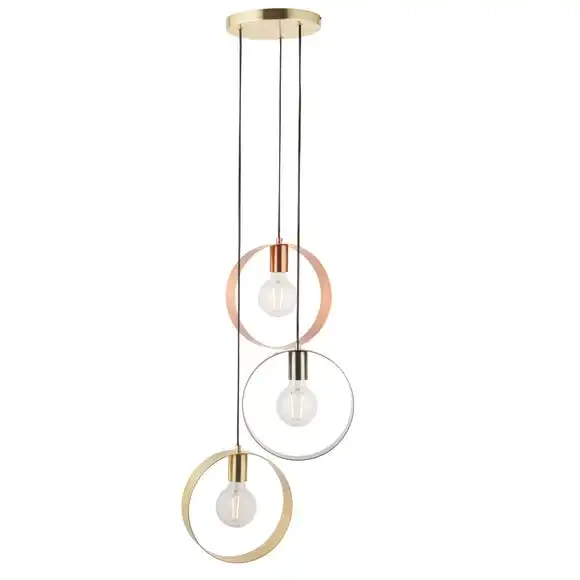 Featuring a three shade design in nickel, gold and copper colourways, the Circ 3 light mixed pendant fitting is the perfect way to add some fun, modern styling to your home. This minimalist ceiling light features fully height adjustable black flex suspension and open circular shades, making it perfect for pairing with statement LED filament bulbs to complete the modern aesthetic.