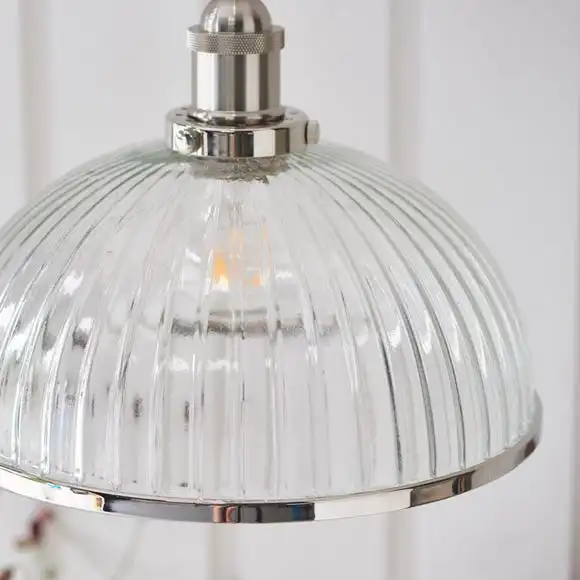 Designed with an authentic ‘resto’ industrial style, the Paxson pendant fitting is beautifully finished in bright nickel plating, complete with an authentic knurled lamp holder design and a vintage style clear ribbed glass shade . Suspended from height adjustable black fabric flex this piece is fully height adjustable and perfect for pairing with filament LED bulbs for that perfect industrial style. The perfect addition for today’s stylish homes to create a trendy bistro look.