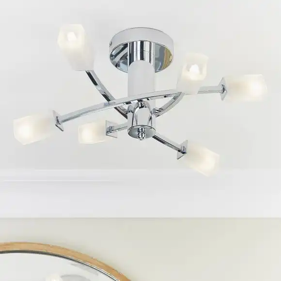 Add a touch of elegance to your home decor with this semi-flush light that has been stylishly crafted with chrome plates and six beautifully frosted rectangular glass shades, making it perfect for any home, specially homes with low ceilings. A contemporary light that is also dimmable to help create the perfect ambiance for any occasion. This light is the ultimate combination of futuristic style and functionality.