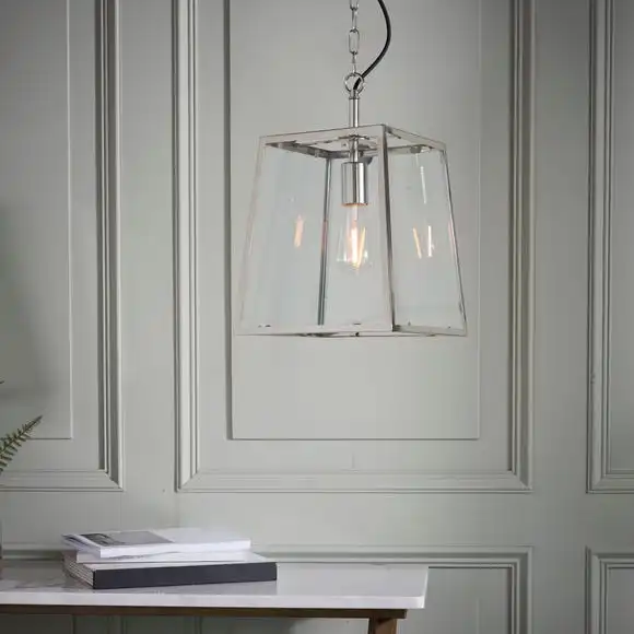 Inspired by box lanterns, the authentic and timeless Idabel Pendant fitting is the perfect compliment for today’s relaxed classic interiors. This stunning fitting is finished in bright nickel and suspended from a fully height adjustable chain with black fabric flex. This piece is perfect for pairing with vintage style filament LED bulbs, perfectly framing them within the subtle metalwork frame and large clear glass panels.