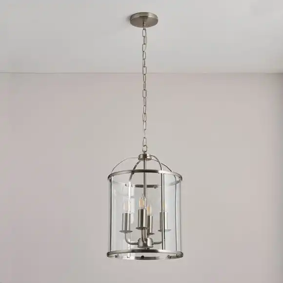 This lantern inspired four light pendant is a perfect way to add a classic yet contemporary element to enhance your home decor. Perfect for any living space, this stunning light is satin nickel plated and designed with clear glass panels for a tradition feel. This beautiful light is also height adjustable at the time of fitting and dimmable to help you creat the perfect ambiance and style. The ultimate combination of design and functionality.