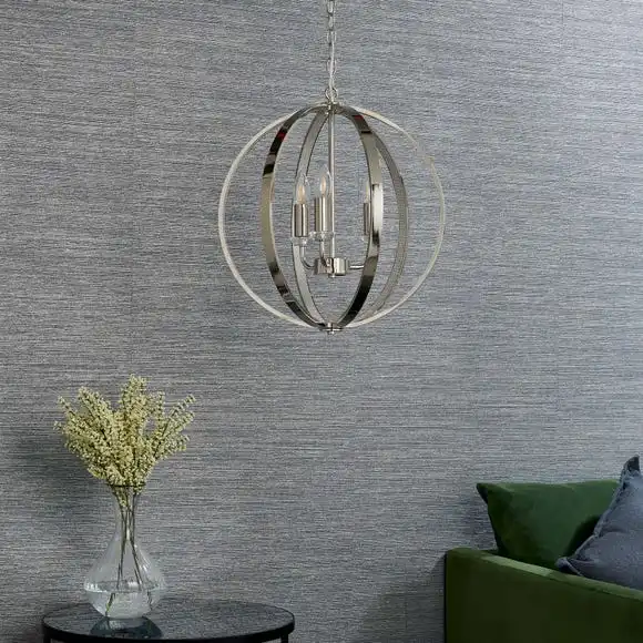 Boasting a modern open frame design, this dimmable ceiling light is perfect for adding a stylish touch to any room. With a bright nickel plated finish this light is modern and is also encrusted with thousands of clear faceted reflective detailing. This ceiling light fitting has an adjustable height and is perfect for use with E14 LED lamps.