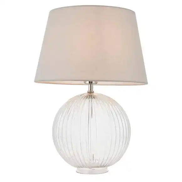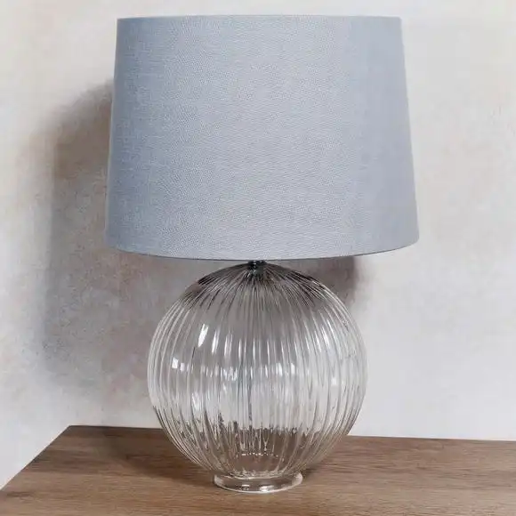 Featuring a striking and shapely table lamp, the Vogue Sur is beautifully crafted with a distinctive Smokey Grey tinted ribbed glass base and a satin nickel plate finish. Complement the base with a stylish soft pastel or vibrant shade to complete the look. This table light will blend in beautifully with a range of home interior styles.